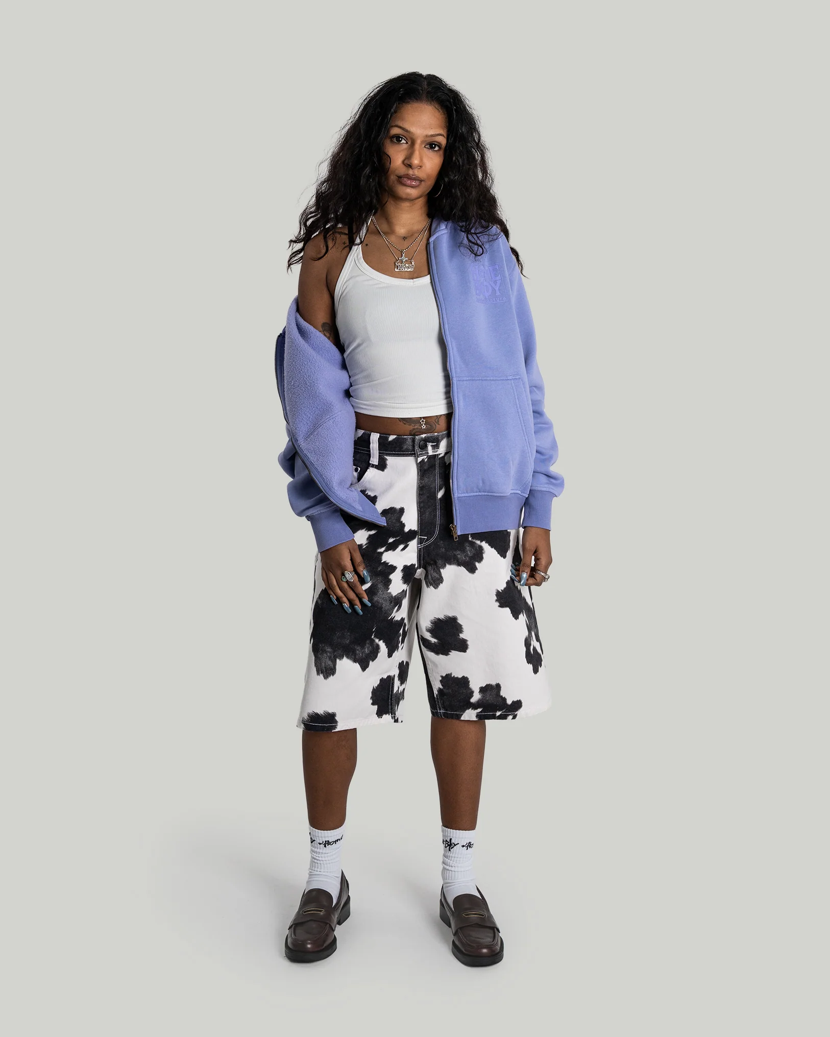 Der kontrastreiche Cow-Print in Schwarz und Weiß greift den Western-Look auf und übersetzt ihn in moderne Streetwear. Perfekt kombinierbar mit cleanen T-Shirts, Tanks oder Oversized Tops für auffällige Summer-Fits.